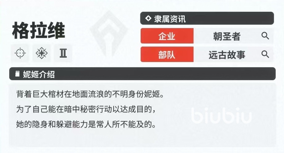 格拉维属于朝圣者企业远古故事部队,为了能在暗中秘密行动达到目的,它的隐身和躲避能力都是非常出色的。自身属于燃烧代码,可以对风压代码敌人打出额外伤害。使用的武器为步枪,装弹数60发,换弹时间两秒钟,操作起来不需要蓄力。在定位方面属于辅助型的职业。第1个被动放热,结束预知未来状态时自身子弹减少,换弹率降低,放热后就可以解除条件,自身处于放热状态时恢复相当于最终最大体力2%的体力值,间隔一秒钟。