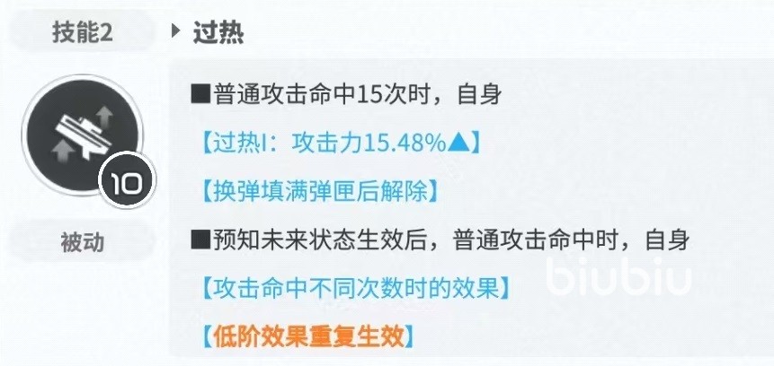第2个被动过热,当普通攻击命中15次时,自身就可以进入到过热状态,攻击力提升,换弹填满弹匣后解除效果。预知未来状态生效后,普通攻击命中时,自身将根据命中不同次数获得不同效果。当命中30次,处于预知未来和过热1状态时达到过热2状态,攻击力提升。攻击次数60次,处于未知预知未来和过热2状态时,达到过热3状态,攻击伤害提升。