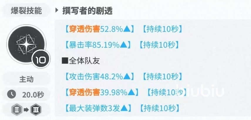爆裂技能撰写者的剧透,自身可预知未来,目前体力降低,获得无限装弹和穿透强化、穿透伤害、暴击率提升,持续10秒。全体队友的攻击伤害、穿透伤害和最大装弹数都能获得提升,持续10秒钟。爆裂技能带来的提升能力堪称恐怖,所以在辅助方面是团队中很抢手的人选。