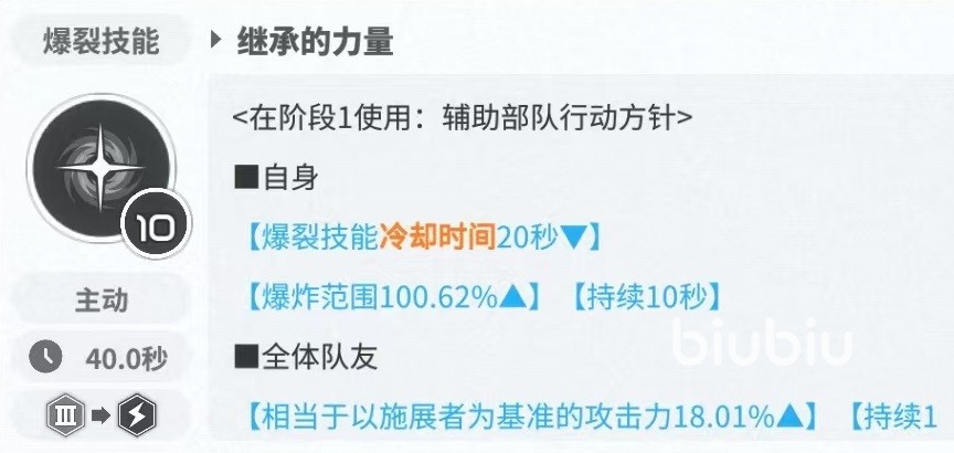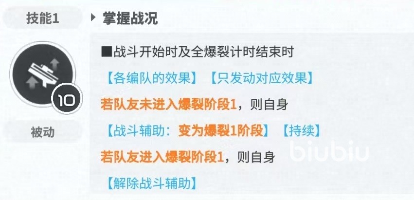 第1个被动技能使得拉毗可以根据队伍的需要,作为爆裂1或者是爆裂3来使用。在爆裂1时,该角色更像一个支援作用,有着较高的冷却缩减,还提供了伤害输出效果,可以在队伍中直接替代丽塔来使用,实现更快的爆裂循环,更高的队伍伤害和增加输出伤害效果。这样的机制在目前角色中是比较有特点的一个,也是很多新手玩家一开始不知道如何上手的原因。