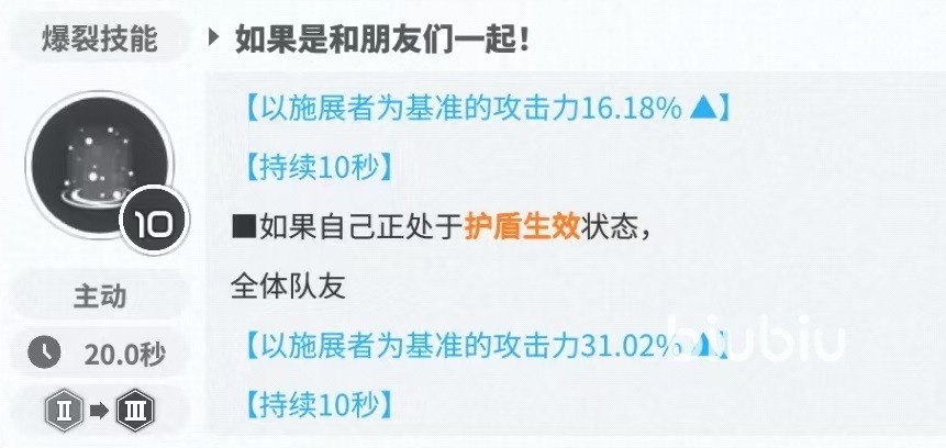 第二个技能友谊支援,进行5次普攻时,攻击力最高的两名队友提高核心伤害,进行5次普通攻击时,剩余体力比例最低的两名队友恢复体力。爆裂技能如果是和朋友们一起,自身获得穿透特化,全体队友获得攻击力提升,如果自身处于护盾生效状态,全体队友再次提升攻击力。因为这名角色可以提供独特的核心伤害增益效果,并且提供了生命和掩体恢复,这样在队伍生存能力方面的表现就变得非常出色,可以提供较高的进攻支持。