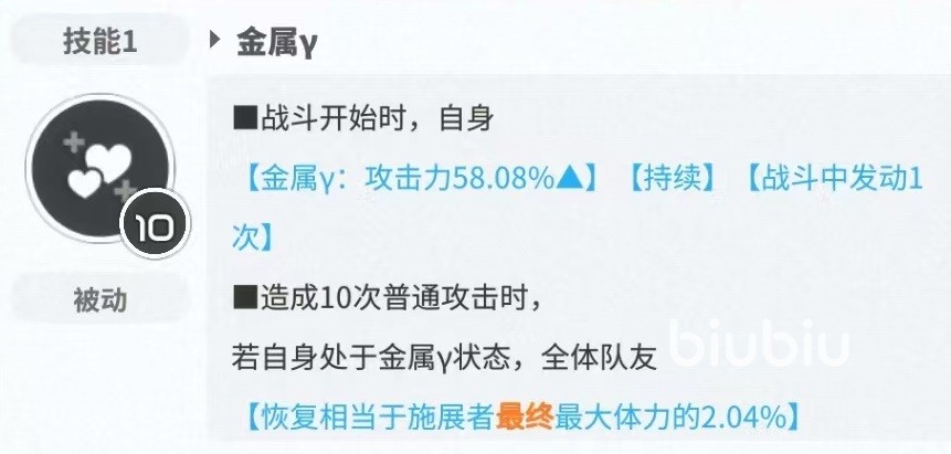 第1个是被动技能金属γ,在战斗开始时自身获得攻击力提升效果,战斗中发动一次,持续生效。当造成10次普通攻击时,如果此时自身处于金属γ状态,那么全体队友将获得一次体力恢复效果。另外如果队友处于无法战斗状态时,而且自身处于金属γ状态,那么自身除外的无法战斗状态中,攻击力最高的一名队友将会以96%体力复活。当队友处于无法战斗状态时,自身解除金属γ效果。