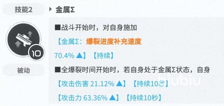 第2个技能是金属∑,战斗开始时,对自身施加爆裂进度补充速度增益效果,属于持续类型。全爆裂时间开始时,如果此时自身处于金属∑状态,那么自身伤攻击伤害提升,攻击力提升,并且将金属∑状态解除。全爆裂时间开始时蓄力时间最长的一名队友降低蓄力时间,全爆裂时间结束时,如果此前自身使用过暴力技能,则自身获得金属∑。
