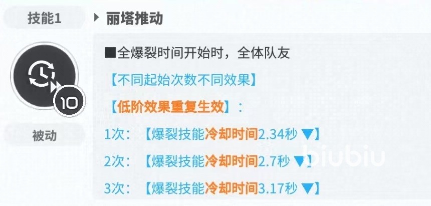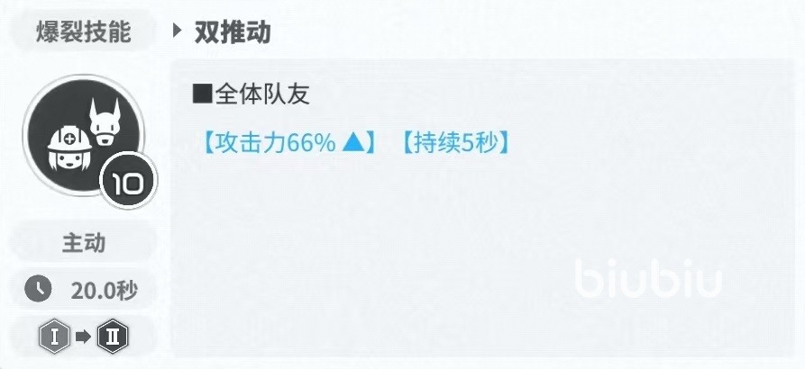 第2个是主动技能福特推动,掩体体力最低的两名队友,掩体体力恢复52.5%,爆裂技能是双推动,对全体队友都能够带来66%攻击力提升效果,持续5秒钟。在加点的时候,被动技能和爆裂技能是优先加点,不仅是前期,后期也是如此,这两个技能应该优先加到满级。而主动技能福特推动可以前期点一些,这样能做到快速优先发展。