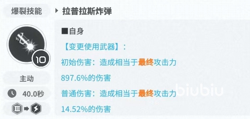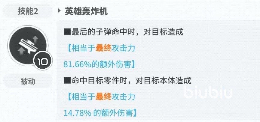 第2个被动英雄轰炸机,在最后的子弹命中时,可对目标造成额外伤害,命中目标的零件时,对目标本体还可以造成额外伤害。爆裂技能拉普拉斯炸弹,自身变更使用武器,初始伤害和普通伤害提升,追加效果穿透特化,在爆裂技能释放过程中无法隐蔽,如果自身处于英雄使命最大叠加状态下,那么对同一敌人造成额外无视防御力的伤害。