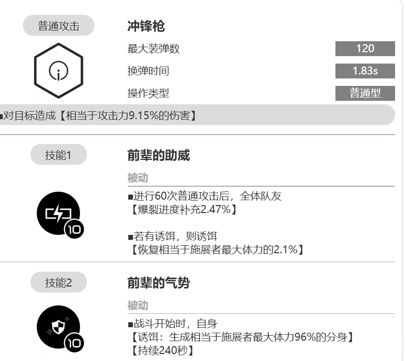 莱伊的被动是每射击60次的时候,可以提升全队的爆裂的进度,其实提升每个人大招的恢复速度,这个技能可以强化全队的输出频率,尤其是依赖爆裂技能的角色,可以很好地释放关键大招。