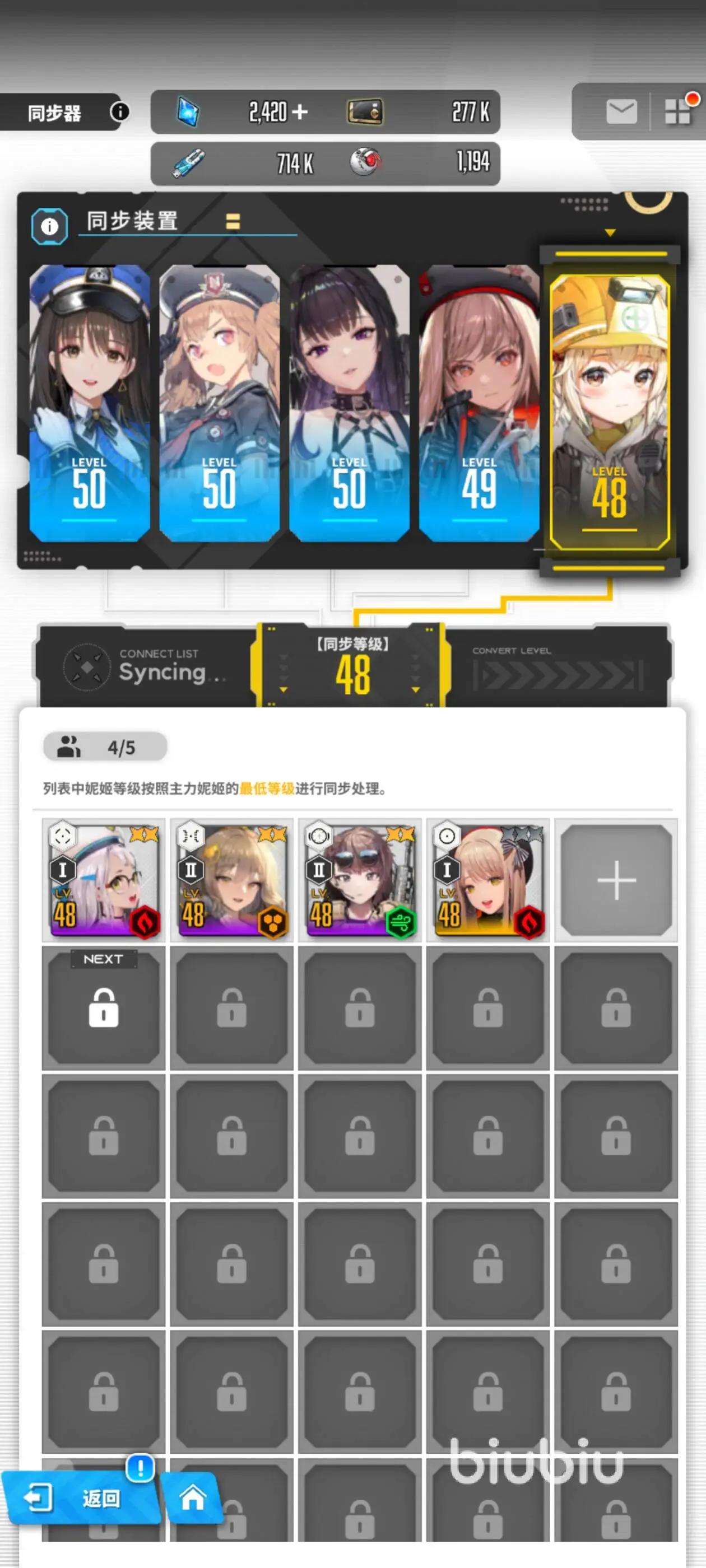 然后就是同步器,这个机器的最大作用就是将低等级的角色一键升级,比如说选择当前最高等级的角色,然后再放五个低等级的角色,然后就开始同步,最多可以放五个角色,等待一段时间,这五个最低等级的角色就会跟最高角色的等级一致,这样直接减少了一大批的材料,不过这个同步器的解锁需要通关4-15,所以新手玩家要记得快速推主线哦。