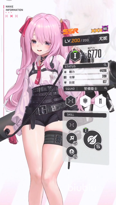 她是一名水冷属性的SR防御角色,和尤妮是同伴,面容清秀的御姐型角色。普通攻击“步枪”,对敌人造成攻击力15.07%的损伤,核心伤害达到200%。被动1“忍耐”,当最后的子弹命中,她自己的暴击伤害会持续10秒增强8.18%。