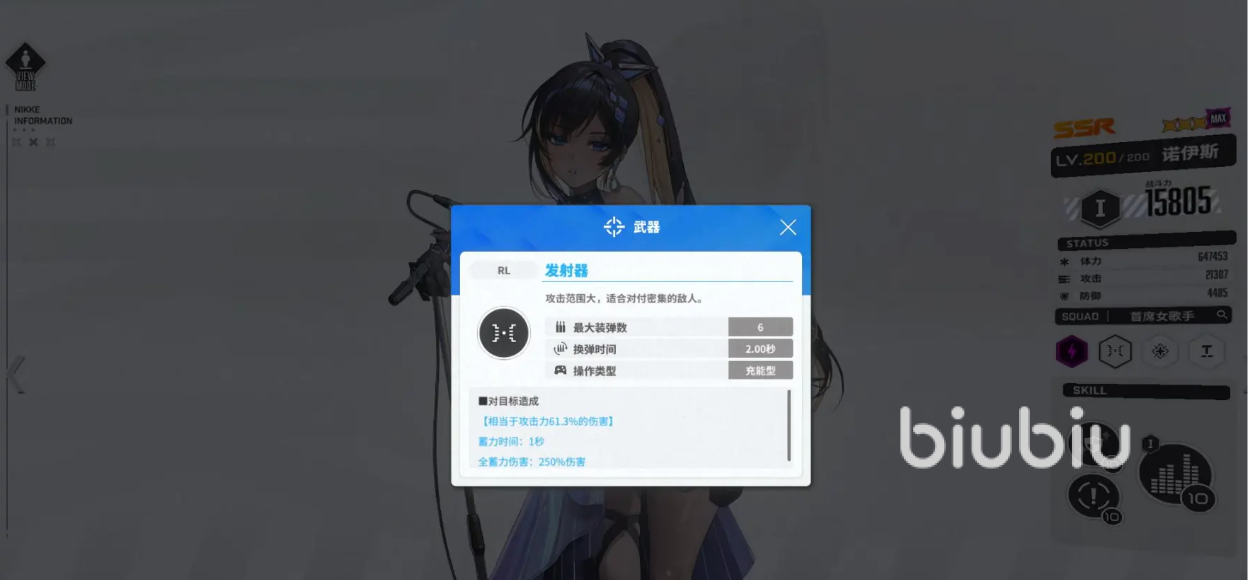 她的武器是发射器,通过平a可以造成61.3%攻击力的伤害,特点是攻击范围大,适合对付密集敌人,但换弹时间较长(2秒)。技能1叫做合声,一旦自己被攻击20次后,全体队友被击伤害降低,所以防御能力较强。