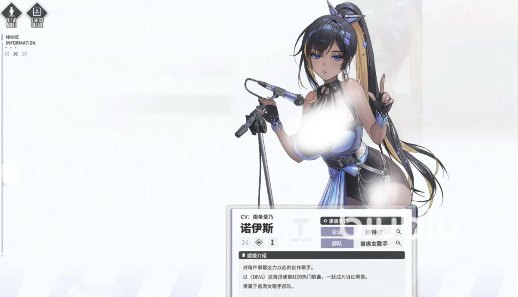 诺伊斯是泰特拉企业旗下的首席女歌手,该团队由流行音乐歌手组成,对大众文化有强大影响力。自身擅长使用发射器为团队提供恢复、增益和控场效果,所以战斗能力不俗。性格方面的话,她是一位全力以赴的创作歌手,凭借热门歌曲《DIVA》迅速走红,性格开朗,战斗时也带着娱乐精神。