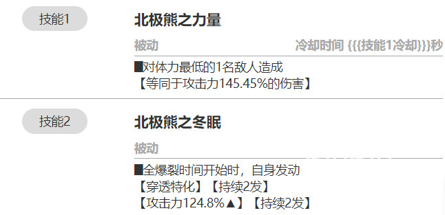 技能2叫做北极熊之冬眠(被动),当全爆裂开始时,自身获得“穿透特化”效果,并提升攻击力16.8%~124.8%(持续2发子弹)。技能3则是北极熊之咆哮(主动),用了后可以提升自身暴击率13.98%~31.95%和命中率9.64%~22.04%(持续20秒)