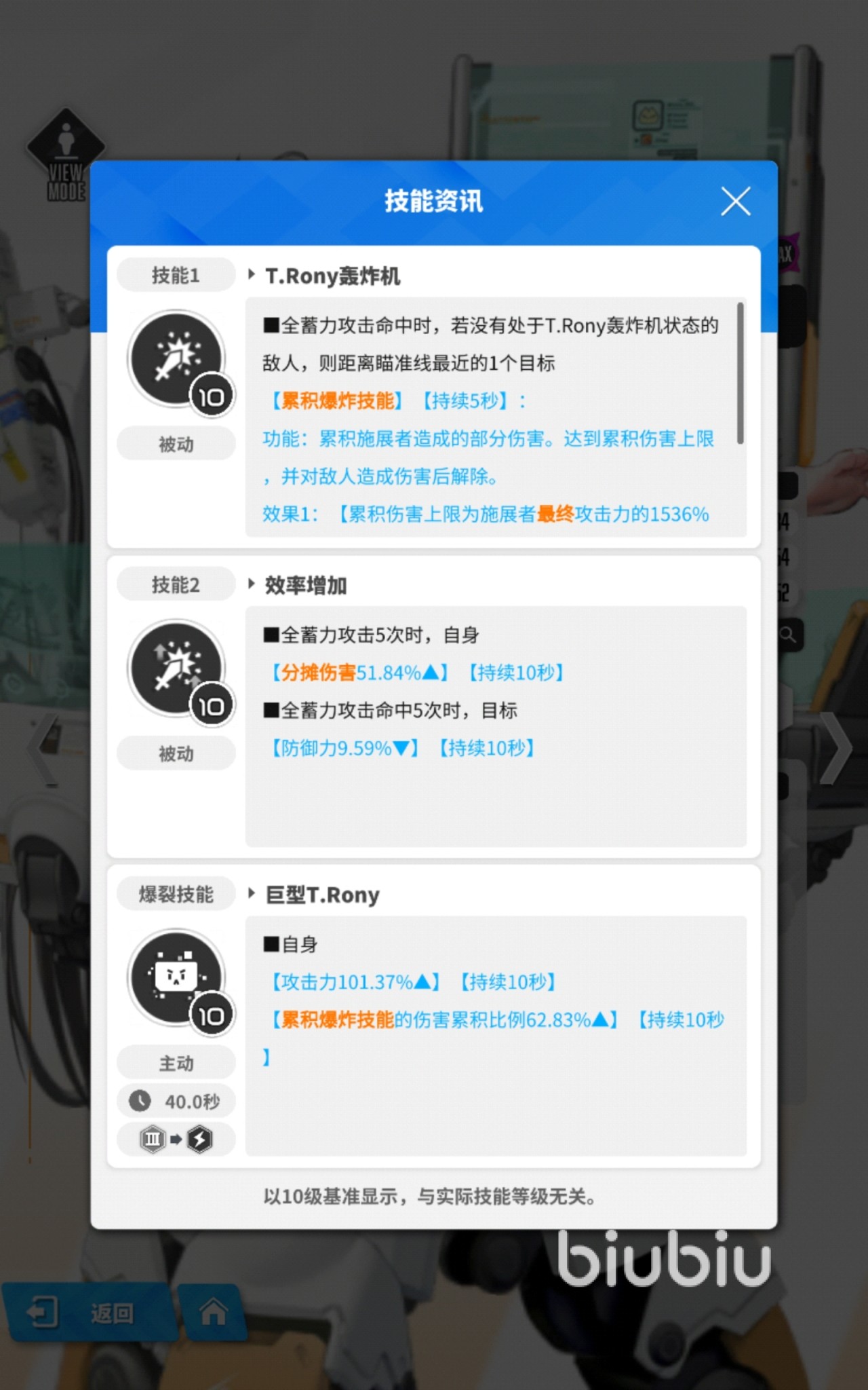 特罗尼的的普通攻击使用狙击步枪,蓄力后能造成高额单体伤害,同时为目标附加TRony轰炸机效果,每秒持续造成伤害。使用效率增加这招后,会对范围内所有敌人造成一定比例的分摊伤害。最后在放出巨型TRony,进一步升高自身的攻击力,同时还会增加累积爆炸伤害,这一机制让她在持续输出中兼具爆发能力,尤其适合应对血量较厚的精英敌人或需要快速清场的场景。手动操作时,建议优先锁定高威胁目标,通过精准蓄力快速叠加状态,最大化连锁爆炸的收益。