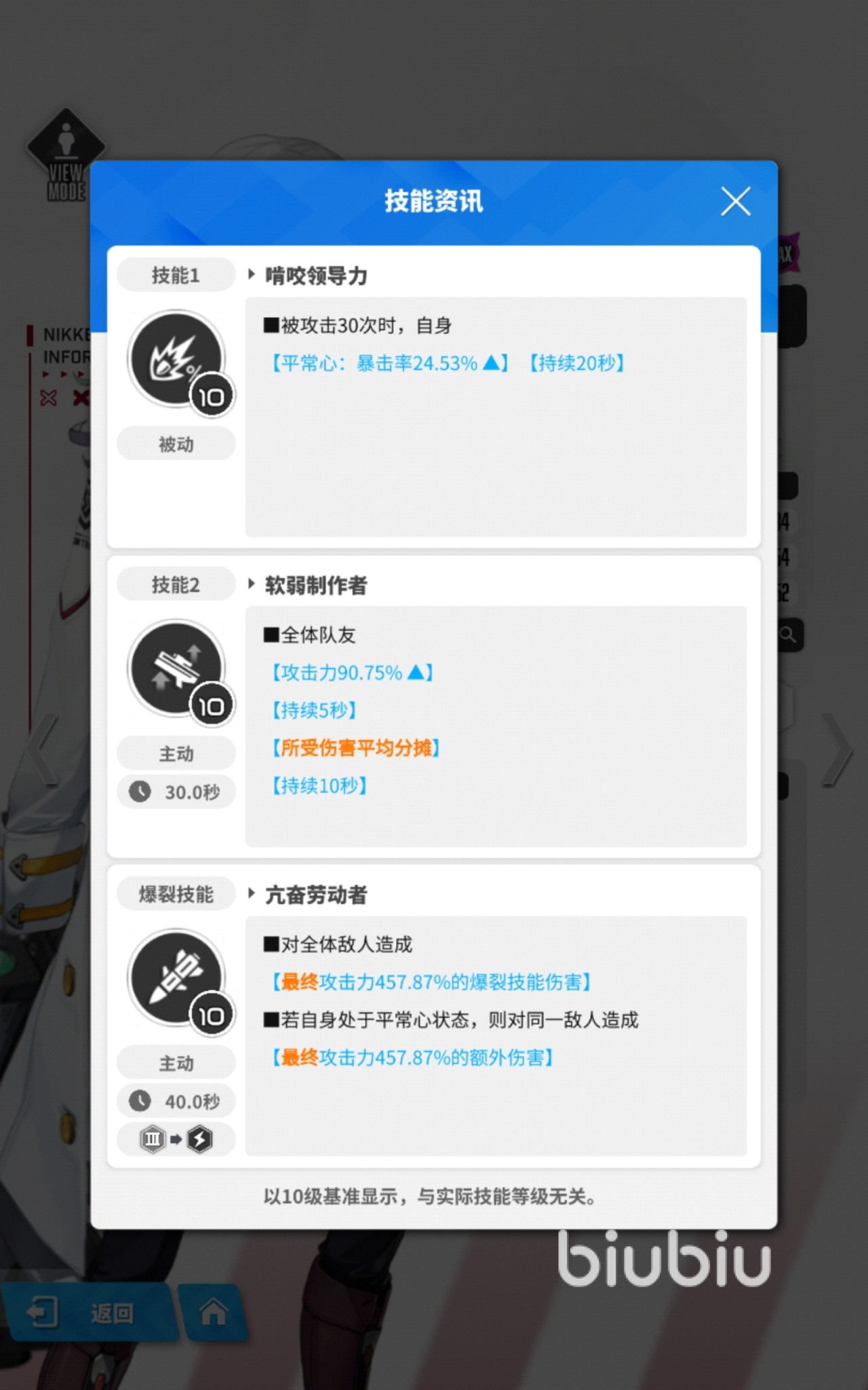 尤尔夏的被动技能啃咬领导力在被攻击30次后触发,能提升自身暴击率并持续20秒,这个机制让她在承受火力时越战越强。主动技能软弱制作者则是团队的保命关键,能为血量最低的5名队友,提供额外的攻击加成,同时开启10秒伤害分摊效果,相当于给脆皮输出角色套上一个护盾。而她的爆裂技能亢奋劳动者,在平常心状态下,能对全体敌人造成两次高额伤害,配合破防效果可瞬间清场。