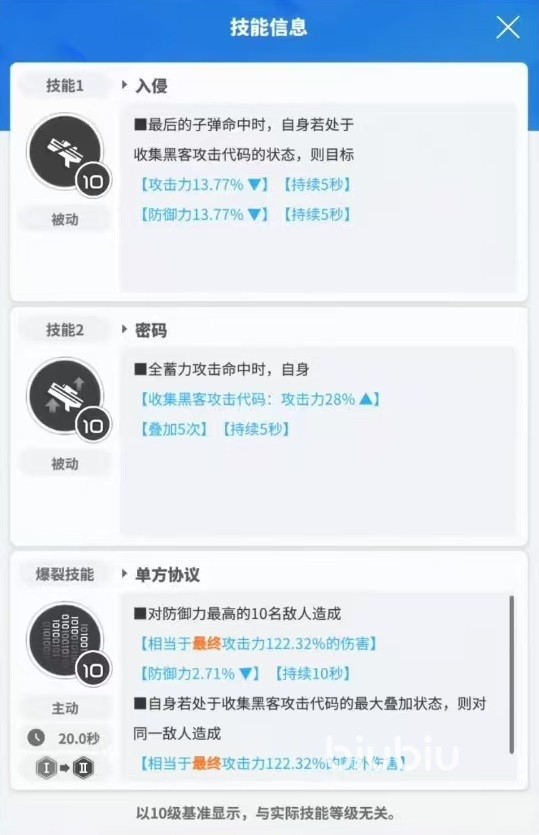 爆裂技能单方协议,冷却时间20秒,对防御力最高的10名敌人,造成相当于最终攻击力122.32%的伤害,同时降低对方2.71%的防御,持续10秒钟。如果使用爆裂技能时,自身处于收集黑客攻击代码的最大叠加状态,那么对同一敌人可以造成一次122.32%的额外伤害,还能使目标所受伤害提升10.76%,持续10秒钟。艾可希雅的这三个技能相互配合非常好,只要能够在攻击代码状态之下,那么每个技能都可以飞后发挥出最强的威力。