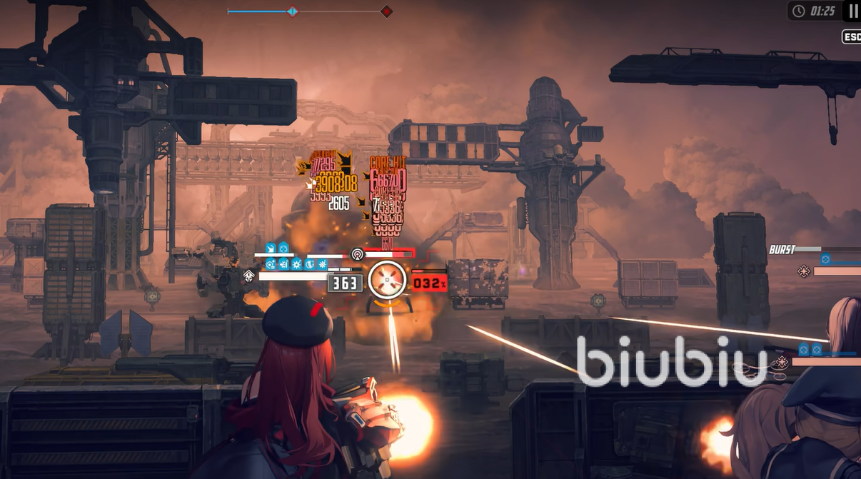 游戏的核心玩法是第三人称射击(TPS),玩家可以手动瞄准敌人弱点或切换自动战斗模式。战斗分为“爆裂阶段”,需要合理搭配不同阶段的妮姬技能来触发强力爆发。所以要合理搭配妮姬才行,至少要有辅助和坦克,不能全是输出。