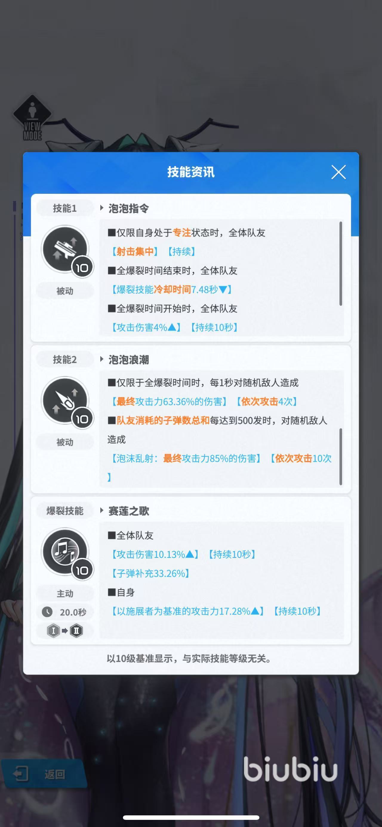 二技能叫做泡泡浪潮,全爆裂时间时,每1秒对随机敌人造成高额伤害,并攻击四次。队友消耗的子弹数总和每达到500发时,对随机敌人形成高额的泡沫伤害。大招叫做赛莲之歌,可以提升全体队友的伤害以及弹药填充数,并获得高额攻击力加成。