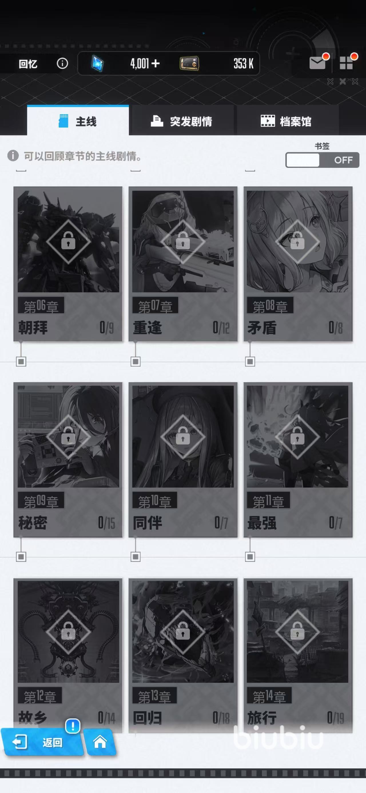 接着点击返回就可以查看下一个剧情,然后后面的被上锁了的剧情便是还未通关的剧情任务。要是想解锁的话就要将对应的任务章节做完才行,不过越后面的章节任务难度就会变得越高,只不过所出现的种类也会更丰富。