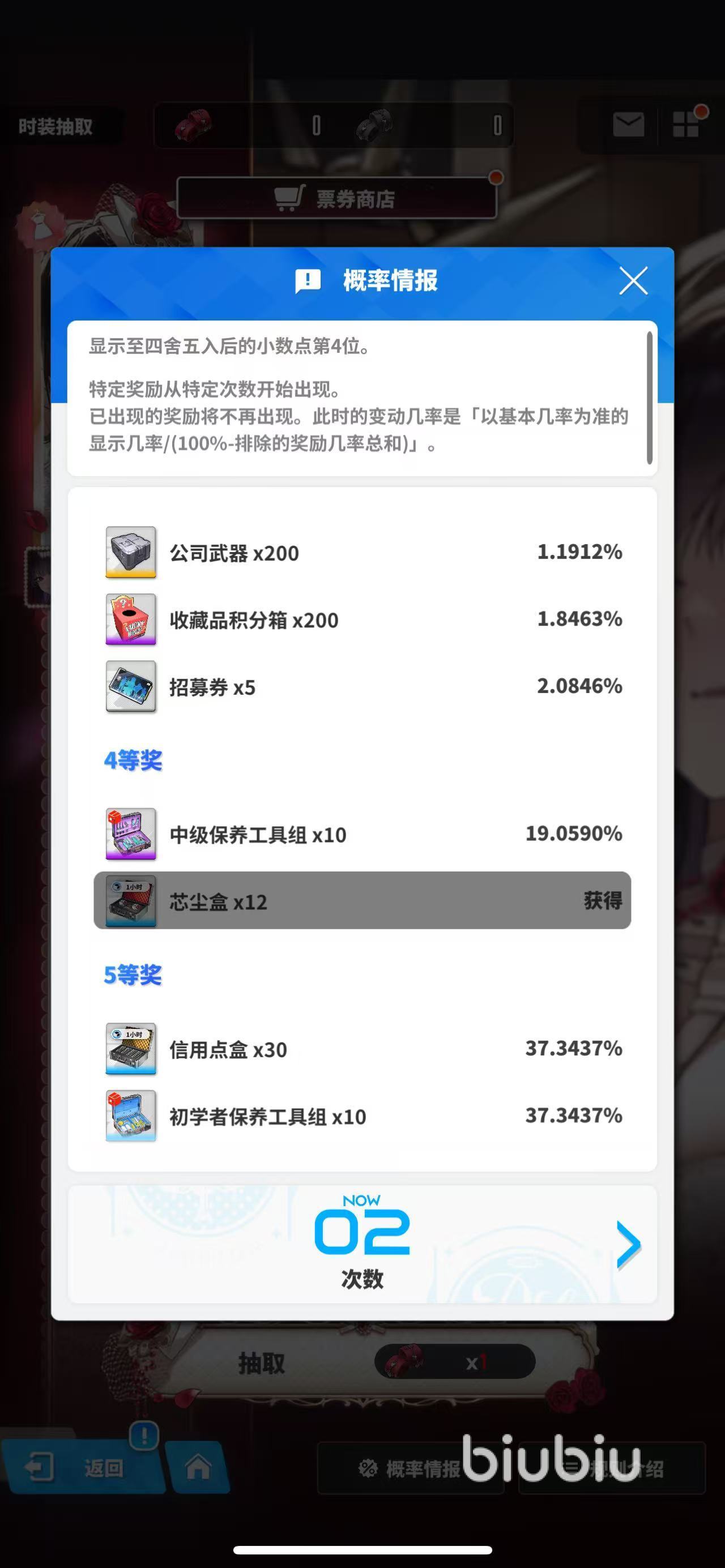 除此之外,在抽取的过程中也有可能获取各种招募券用招募券在卡池抽奖时,同样有一定概率获得保养工具。抽取的话点击下方的抽取即可,一般来说第一天免费一次。后续还要再抽的话,就要充值或者在商店中购买抽卡的道具。快速跳过之后,就可以看到自己可以获取的物品。