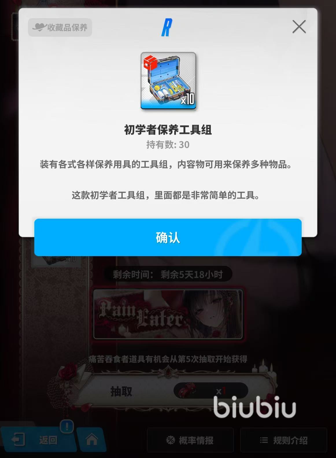 如果大家想要获取帮忙套装,可以点击游戏主页中的时装获取,进去之后就可以在奖励页面中看到保养套装了。在抽奖的过程中就有一定的概率获得初学者保养工具套装,这类工具模组的内容特别多,并且最多可获取30套,里面所装载的都是很简单的工具。