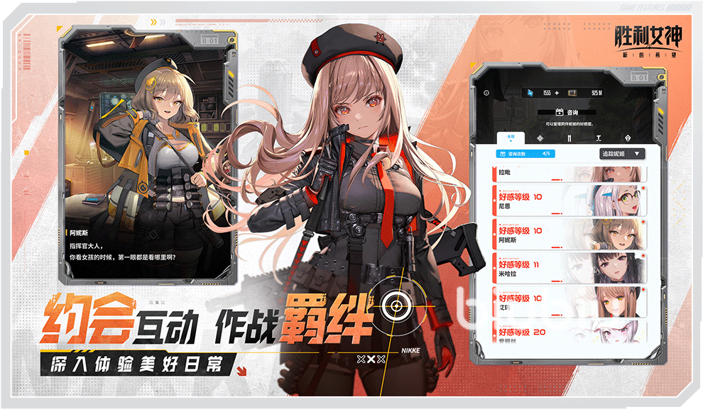 整体来说,虽然是射击,枪战游戏,但也不是无脑操作就可以获得胜利的,每一位妮姬都有一款属于自己属性的武器,主要包括步枪、冲锋枪、狙击枪、霰弹枪、榴弹发射器以及机枪,不同的枪械,其射程远近和攻击方法自然是不同的。