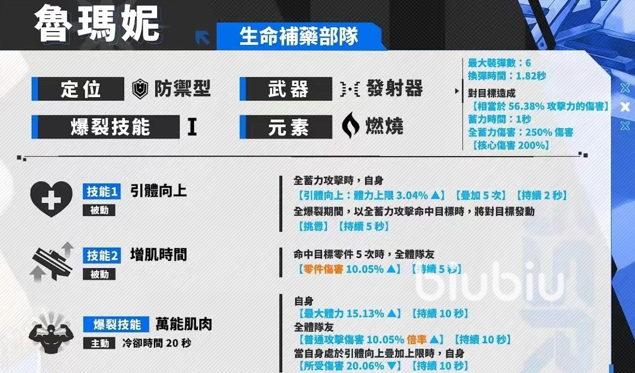 鲁玛妮作为一名防御型角色,自身的技能在很多方面都体现了这样的特点,例如技能1引体向上,在进行全蓄力攻击时,自身体力上限提升。全爆裂期间,蓄力攻击命中目标时,将对目标发动挑衅,强制攻击自身来保护队友。技能2增肌时间,只要能命中目标零件5次,全体醉就可以获得零件伤害提升效果,持续5秒钟。爆裂技能万能肌肉,自身最大体力值提升,全体队友普攻伤害倍率提升。