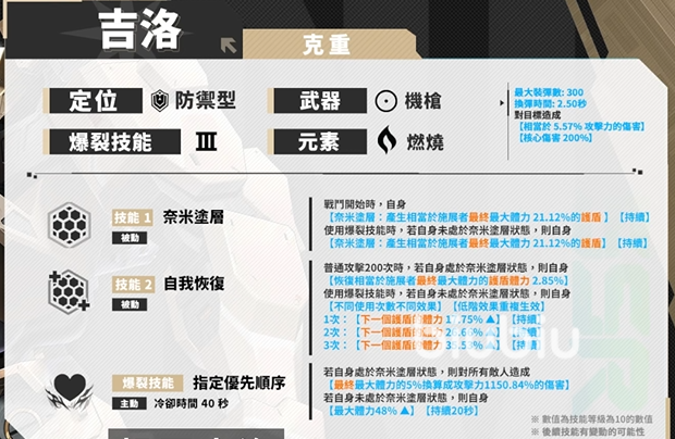 吉洛的最大装弹数是300,换弹时间是2.5秒,基础数值中规中矩。她的一技能属于被动技能,在使用后可以产生相当于施展者最大体力21.12%的护盾,并且是持续性的。二技能也是被动的,当普通攻击200次时,若自己处于护盾状态,则可以恢复相当于施展者最终最大体力的护盾体力2.85%,并且效果会增加。爆裂技能为主动技能,在使用后如自身正处于纳米涂层的状态,即护盾状态,则可以对全部敌人造成最终最大体力5%换算成攻击力1150%的伤害,如果没有在纳米涂层的状态,则可以增加体力。