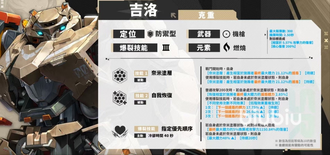 首先这个角色的技能分为了四个技能,第一个他的普通攻击可以对于目标造成相当于一定百分比攻击力的伤害。他的技能一在战斗开始的时候会给自己生成一个护盾,那么这个护盾的厚度就相当于他最大体力的一定的百分比。而且当使用爆裂技能的时候,如果不再处于涂存的状态之下,它就会立即获得一个护盾。