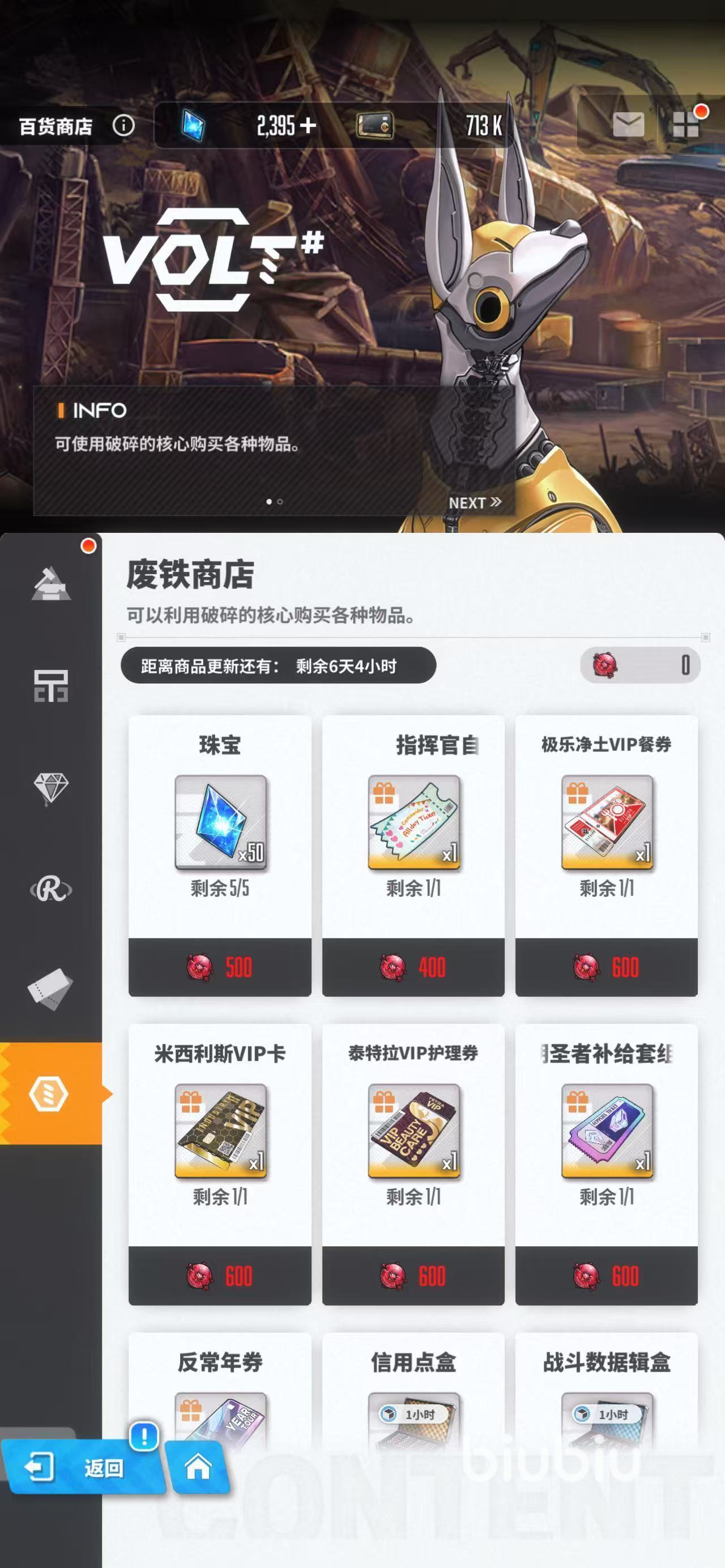 首先大家要先了解需要获取什么物品才能够兑换废铁商店里的道具,在这里需要利用破碎的核心才能购买各种物品。破碎的核心可以通过做任务或者活动获取,这里优先建议大家兑换珠宝,因为每次更新之前只能够兑换5次,所以一共可以获得250个珠宝,毕竟珠宝可以拿来购买商城中的道具或者抽卡。