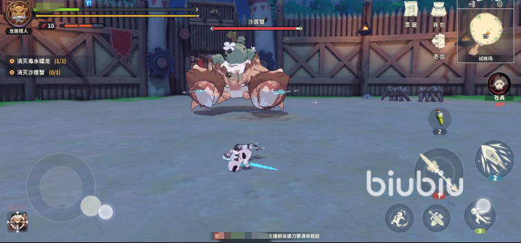 沙居蟹会有频繁的冲装攻击和前扑攻击,当它抬起钳子的时候,就是攻击的前摇,大家可以快速躲开。而且沙居蟹还会潜入地下,从地下冲上来,大家可以多留意地上,因为它冲上来的时候,地面会出现一个漩涡。它的大招是360度喷射沙子攻击,这个大家跟着沙居蟹的喷射的方向走就好了。