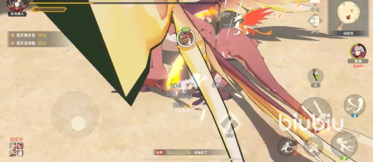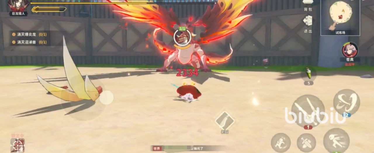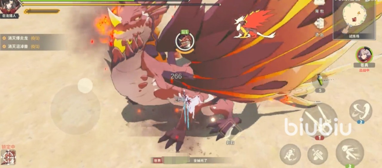 与爆炎龙战斗之前,建议玩家最好先吃点炸肉串补满体力和攻击力,以最好的状态去应战,武器的话,可以带双刀或者巨剑。首先,大家要了解爆炎龙的攻击模式,爆炎龙的攻击就是喷火、前掌拍击和甩尾,它喷出的火会对玩家造成极大的伤害,这也就意味着大家不要正面迎击,同时也要避免被它的尾巴打到,因此玩家可以站到它的侧后方,就是后腿的旁边进行攻击。接着,玩家选择好站位就可以对它进行输出了,可以2技能搭配1技能一起使用,当爆炎龙转身时,玩家要使用3技能冲刺,再一个2技能飞砍起来,这样就可以持续造成暴击伤害。