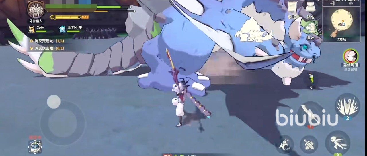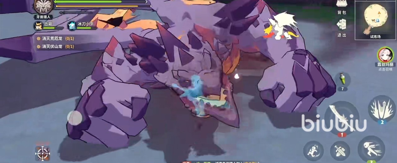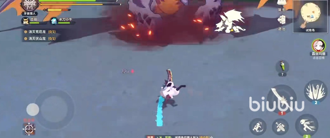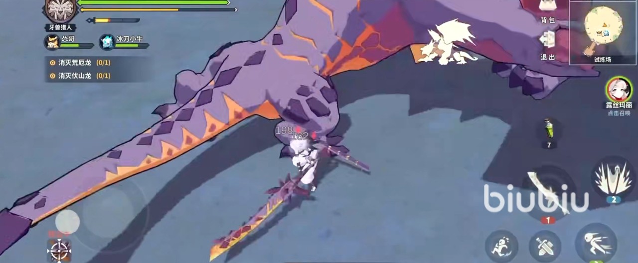 首先入场的是荒厄龙,它比较喜欢用前掌来锤人,将玩家击飞,同时它的尾巴也是攻击武器,一个摆尾就可以把对手拍飞,所以玩家要注意避开它的这些攻击。当荒厄龙与玩家拉开一定距离时,就说明它要开始进行冲撞猛击了,这个攻击的伤害真的很高,可以让玩家掉很多的血,所以大家一旦看到荒厄龙转向、刨地的话,得要赶紧躲开,同时因为荒厄龙的攻击范围比较大,所以建议玩家点一下3技能往旁边飞冲,这样速度快一点。玩家与荒厄龙进行战斗时,尽量别贪刀,最重要的是躲避致命伤害,攻击位置尽量站到它的后方。