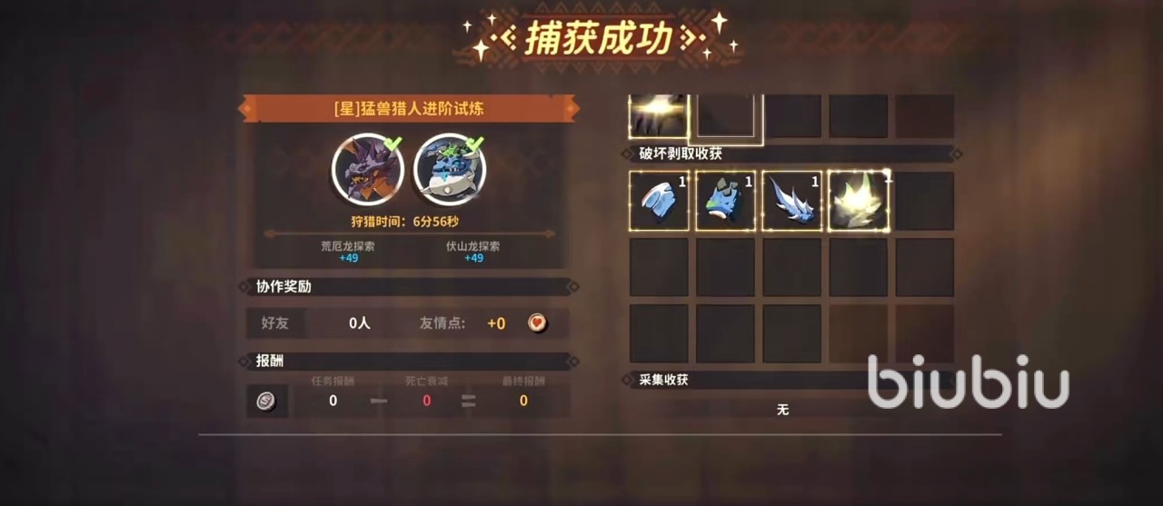 玩家消灭了荒厄龙之后,可以在短时间内赶紧收集它身上掉下来的材料。之后,玩家就会被传送回入口处,趁这段时间,大家赶紧回血,调整好状态,迎接下一只怪物出场。