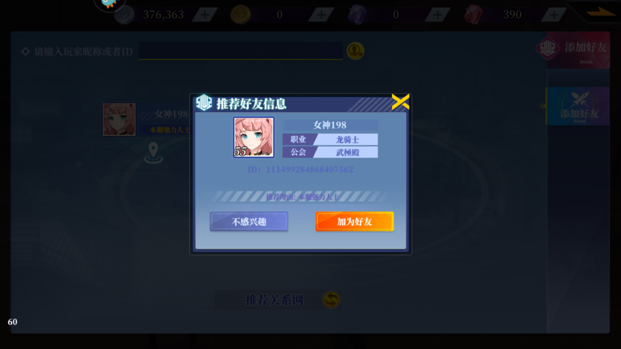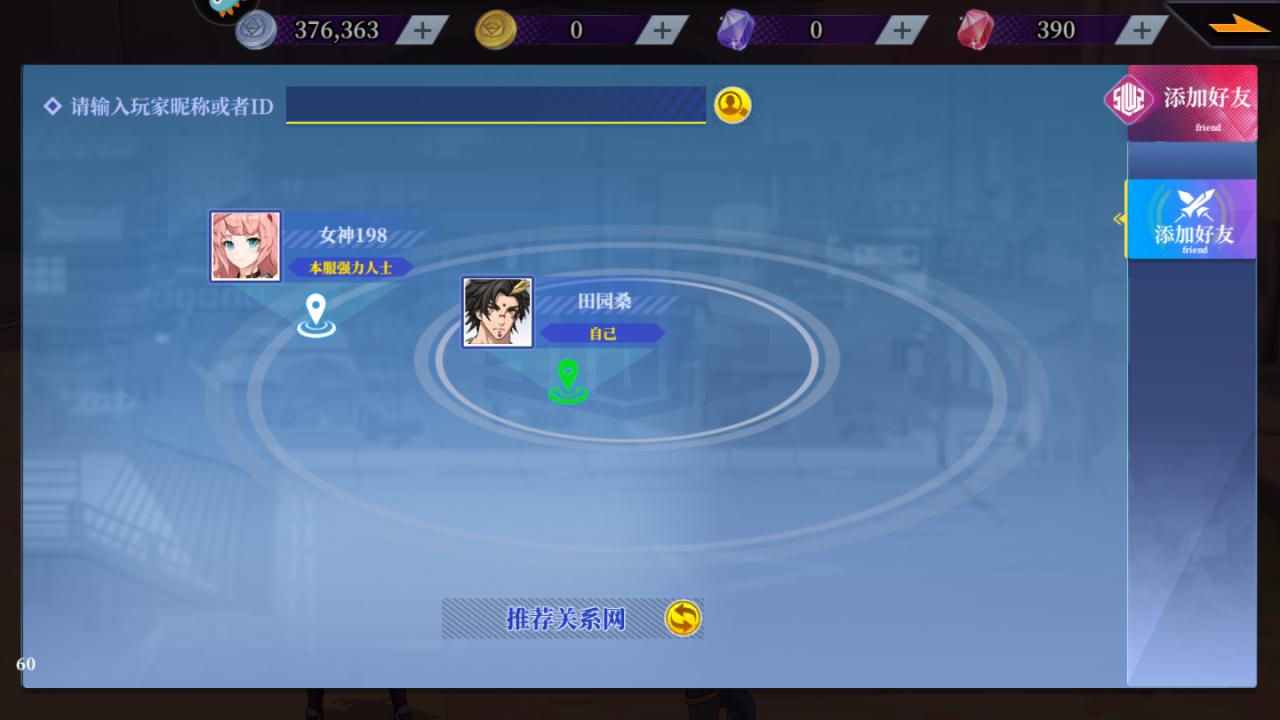 首先先要添加对方为好友才可以进行组队,添加好友的方法如下,先进入游戏主界面找到好友界面点击进入,在左边栏当中点击好友最下面有个黄色的加号,点击添加。在这里我们可以通过关系网来添加好友,或者输入玩家的昵称和ID号码进行搜索添加,添加后需要对方同意才可以互相成为好友。