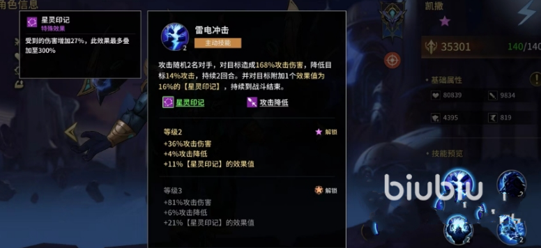 雷电冲击:凯撒的雷电冲击技能能够对两名敌方单位降下雷电冲击,造成大量伤害,并在接下来的2回合内降低他们的攻击力。同时,他还会运用灵能力量对目标施加【星灵印记】,这种印记能够让目标受到更多的伤害。凯撒的雷电冲击不仅能够造成即时的高伤害,其降低攻击力的效果也为队伍带来了战术上的优势,减少了敌方的输出能力。而【星灵印记】的附加效果更是增强了整体队伍对标记目标的伤害输出,使凯撒在团队中扮演了重要的控场和增益角色。这种技能配置使得凯撒在战斗中能够有效地削弱敌方战斗力,同时提升己方的战斗效率。