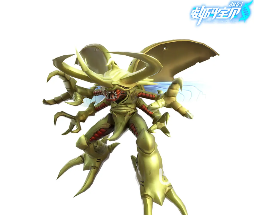 它拥有着巨大的钳与角,全身都散发出耀眼的金光,能在天空中自由翱翔,它的必杀技“千兆爆破”能释放出威力巨大的炮弹,顺利击中不仅能驱散掉目标的多个增益,还会造成真伤,并几率附带上麻痹效果,基本上只要目标受到此次攻击,都会无可避免地惨遭消灭,它的“强化静电场”能让全体敌人进入到缴械状态,使得他们无法在该回合行动。