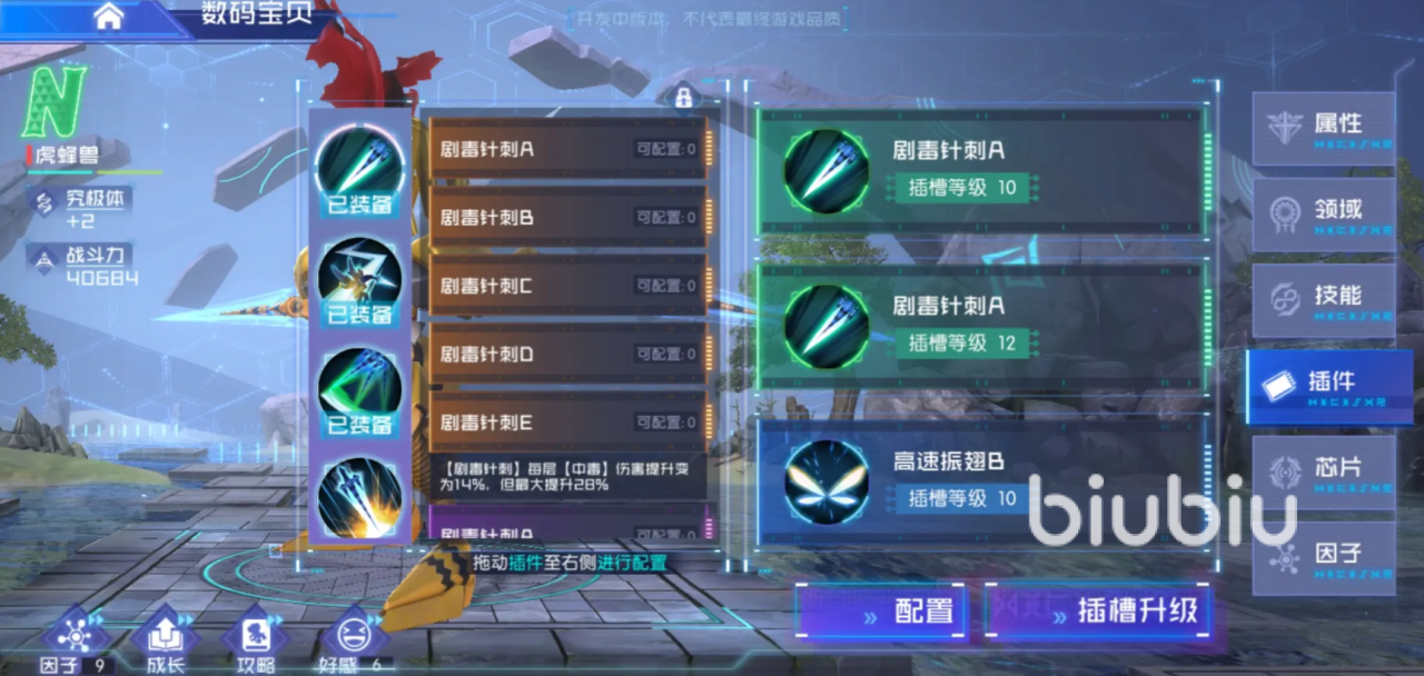 插件是通过副本产出的,也就是团本,每天可以打3次。每个技能有对应的插件,并且有ABCDE这五种类别,以及橙紫蓝绿这四种稀有度划分,当然加成的效果幅度也是不一样的,调配不同的插件就可以做到对数码宝贝的某一点做针对性强化。