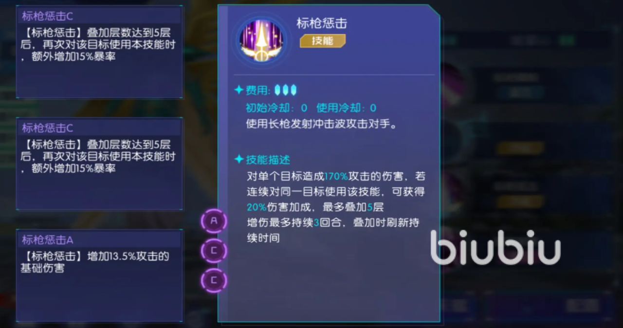 然后就有人问了,那么同一种技能效果加成的插件放在一起效果叠加吗?以图中技能“标枪惩戒”为例,有3个插件,分别是ACC,效果分别是增加13.5%攻击力基础伤害,叠加层数到5层后再次对该目标使用该技能时额外增加15%暴击率。