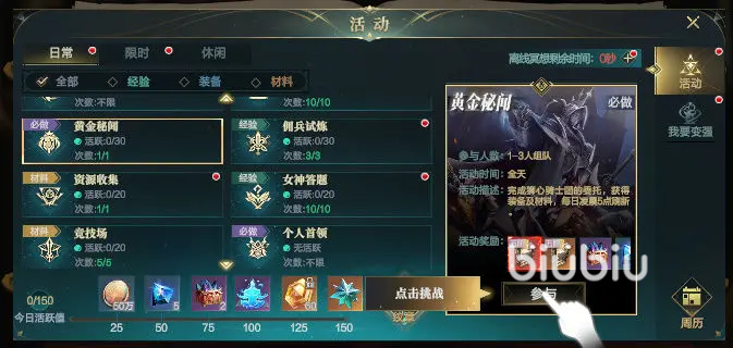 其次是限时任务,该任务的难度适中,能帮助新手小伙伴快速的提高等级,并且还能获得经验,金币,宝石等等的奖励。挑战任务也可以积极的参与,这里可以挂机进行,对角色的属性加成有帮助,同时也有很多实用的强化道具,装备等,任务的难度低,很适合新手小伙伴去做。 首领挑战等到大家的等级达到要求后就会开启,而且每提升5级,就有新的首领任务开启,这里的奖励非常的丰厚,还有高阶装备,红色装备等的奖励。