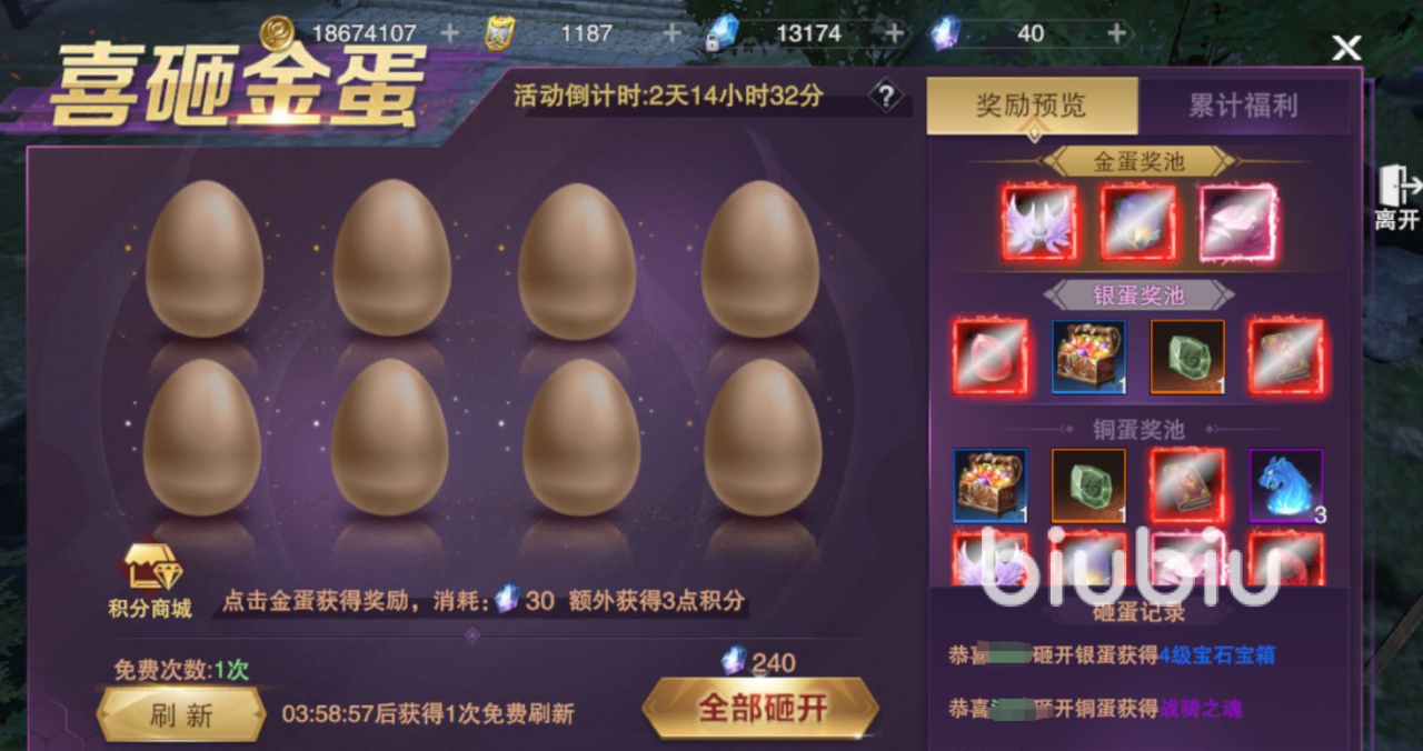 另外还有喜砸金蛋等活动,当你将金蛋砸开之后就可以获得奖励。要耗费一定数额的钻石,当然在一定时间内还可以免费打一次。刷新之后也可以继续免费砸,可以时间充裕的玩家定时上线一下,参与免费活动的话,也可以白嫖一些奖励。