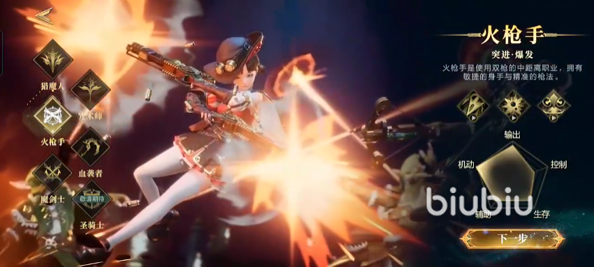 火枪手是中距离作战的强者,他们擅长在作战中使用火力压制对手。尤其是在与敌人产生僵持的情况下,他们更善于突进和打出爆发,能打敌人一个措手不及。初始技一”狂热射击”,使用后快速朝着前方开火,对前面的对手造成伤害,且让敌人的移速降低一段时间。”连环射击“则是,可以连射多次,打出多段的伤害。