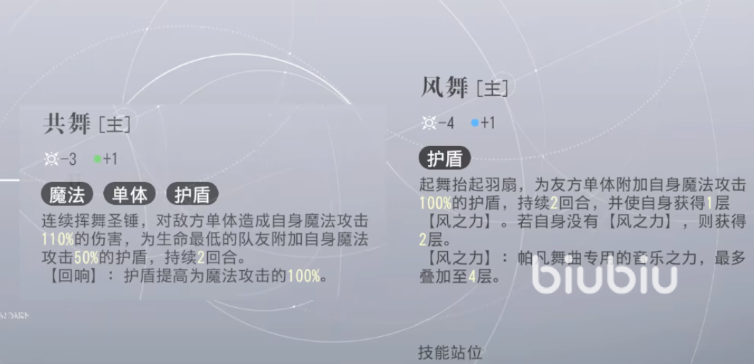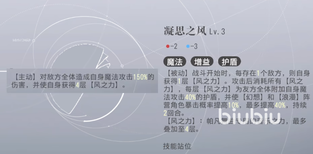 被动是她群体护盾的来源,最高4层,也就是自己魔攻160%的倍率,相当惊人。大招群伤并叠满被动,除开1技能外其他的所有伤害技能都会直接消耗掉所有的风之力来挂盾,不论有几层被动。