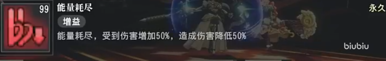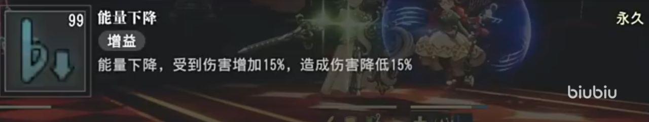 当耐力值降到10点的时候,玩家们会获得一个DEBUFF,这个DEBUFF的持续时间是永久,奏者将会受到能量下降,受到的伤害增加15%,造成的伤害降低15%。如果奏者的耐力值为0,那么受到的伤害增加50%,造成的伤害减低50%。