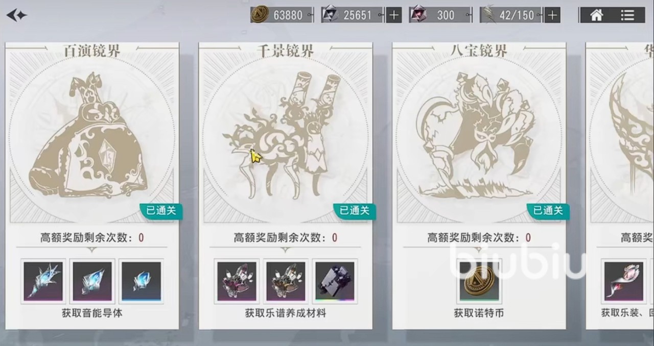 其中,百演境界是我们的常驻升级材料本,可以获得我们的升级材料。千景境界则是我们的技能材料本,通过刷取该副本来获取技能进阶养成所消耗的素材。整体来看,两个材料本难度方面都是较为中规中矩的,靠着官方推荐给予的阵容以及等级,就可以很轻松的过关。
