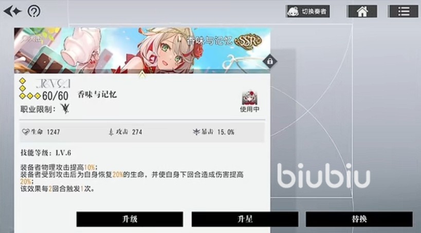 接下来给大家带来的关于升级方面的养成方向之一,就是我们的乐装。与角色本身的培养而言,乐装则相对独立,某种意义上,它类似于隔壁的武器或者礼装的概念。可以提升佩戴者的基本属性以及给予角色佩戴获取的额外技能效果,在给予攻击生命加成的同时,会获得一些额外的技能buff。比如说这个乐装,它可以提高我们携带者的攻击力,并且受到攻击之后恢复一定的血量。