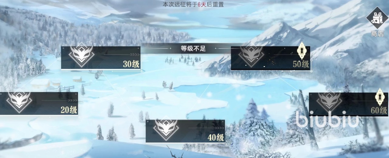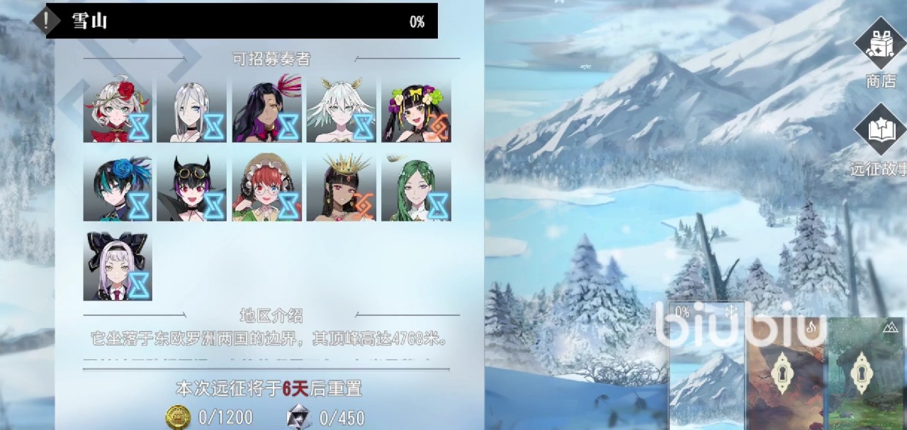 目前,远征总共有雪山,火山和峡谷三个不同的地图。每一张图只能使用系统规定的角色进行挑战,简单来说就是锁了角色人物。其中蓝色的是玩家已经拥有的,而橙色则是没有获得的。但是系统却可以借给玩家使用,因此,虽然锁了人,但可选的阵容余地还是很多的。