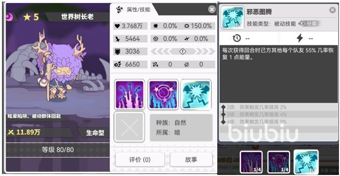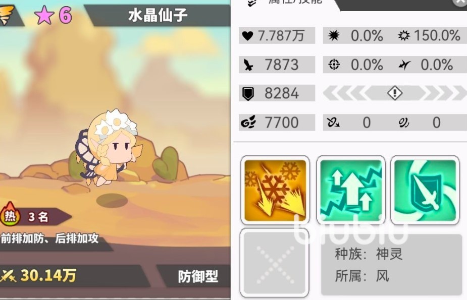 这套阵容里风仙子提速加攻,并且还可以给行动力最少的队友提速,同时减1回合冷却,辅助神技。风镰刀有无视防御的技能,特别适合越战力打。风世界树可以免控并解除队友的控制,也是优先级很高的角色。