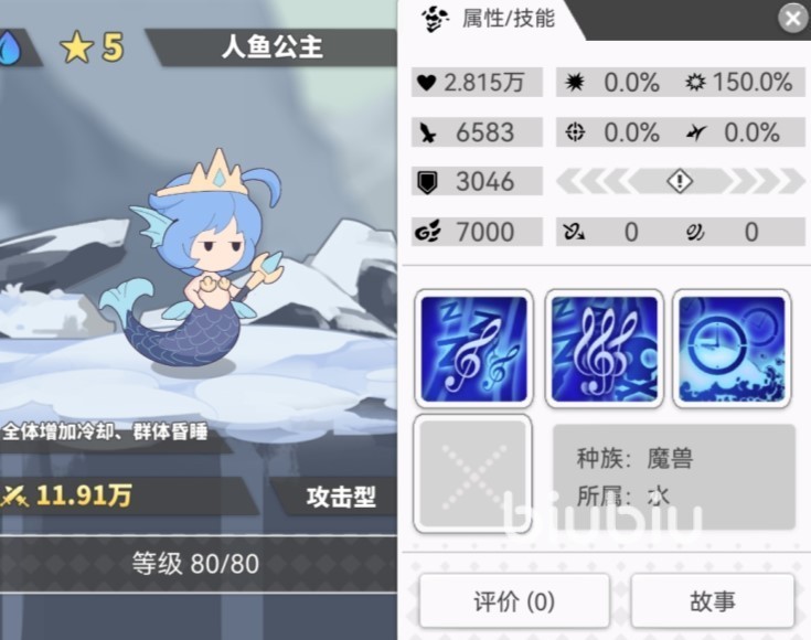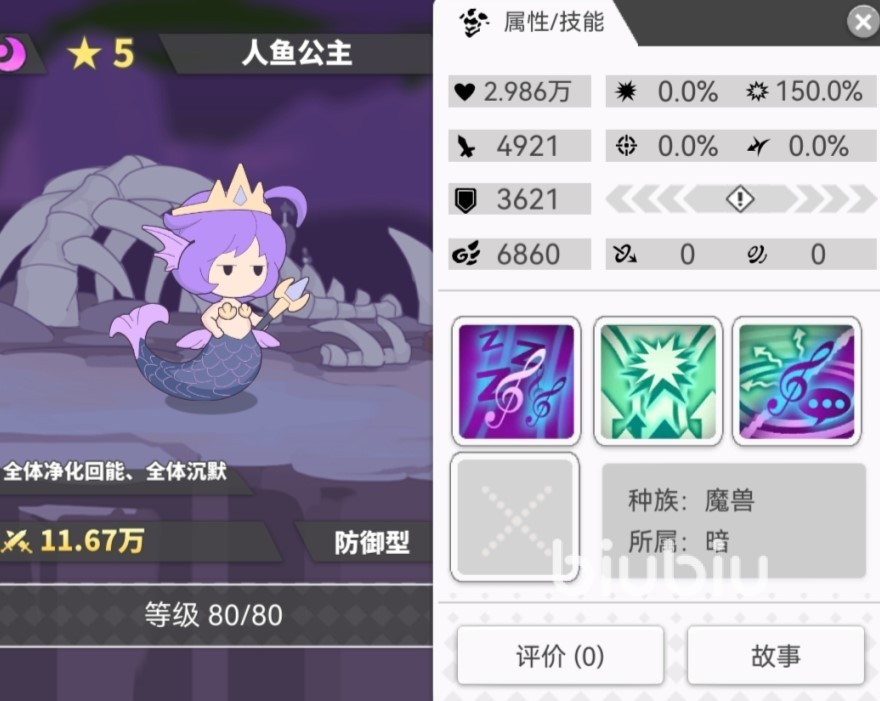 暗属性的人鱼则是防御向的角色,一手全体净化回能和全体沉默能打出十足的控制。而水属性的人鱼则能够增加冷却并造成群体昏睡,是个有很强功能性的攻击型角色。