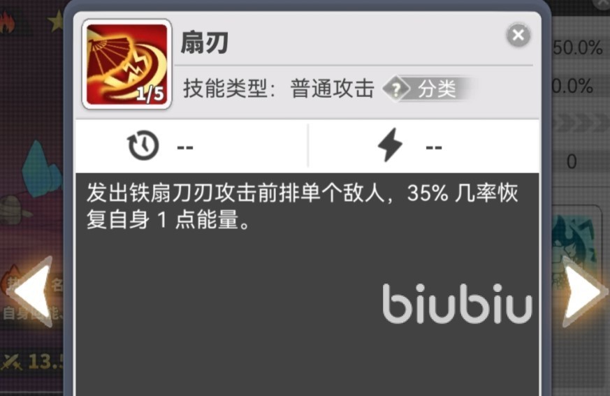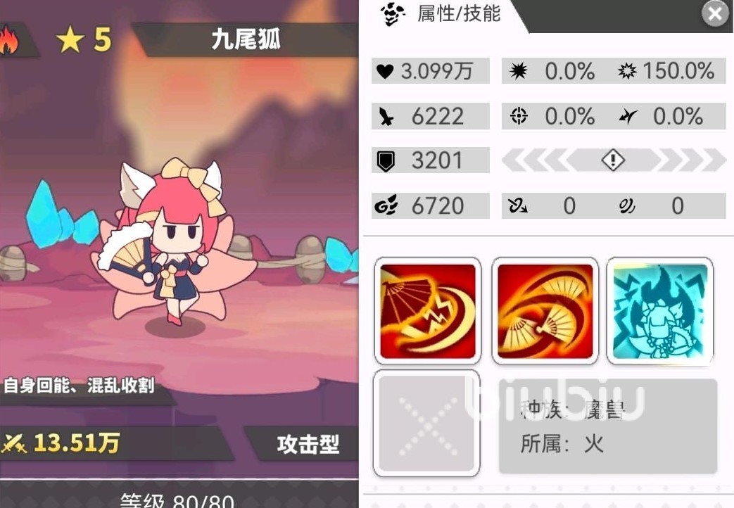 火狐狸普攻技能可以利用贴扇来攻击前排的单个敌人,概率恢复自身1点能量。主动技能可以施放天星来攻击场上生命比率最低的敌人3次,每一次都有一定几率使其混乱1回合,如果这次攻击击败了敌方目标则对敌方全体造成天星攻击。被动技能可以在狐狸释放主动技能时自身恢复1点能量,并且当自身的能量从未满变满时会立即获得回合,适合抢出手。