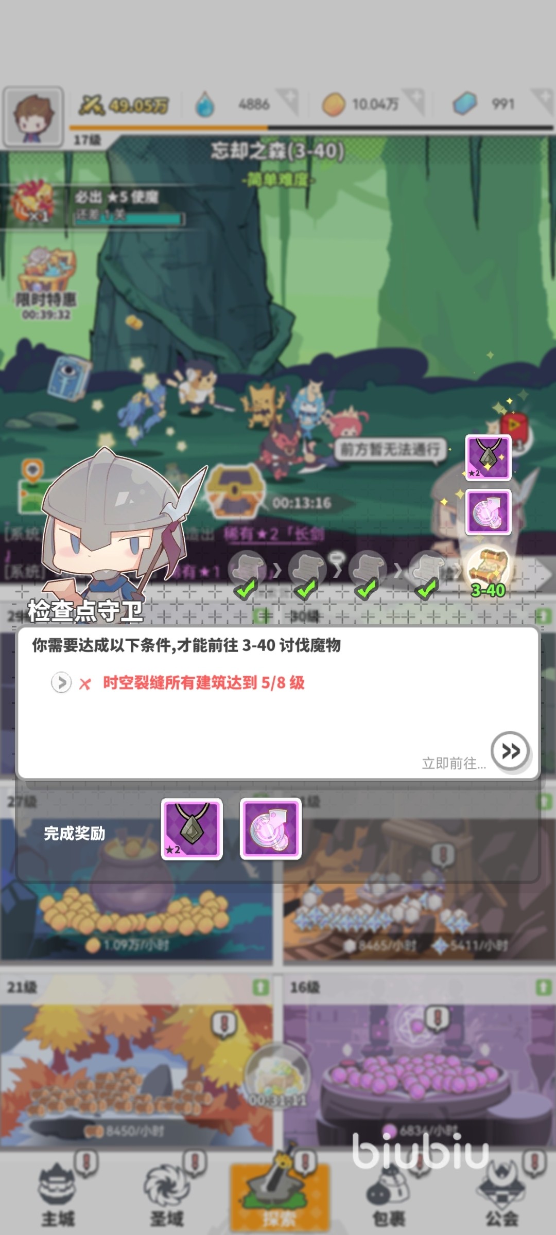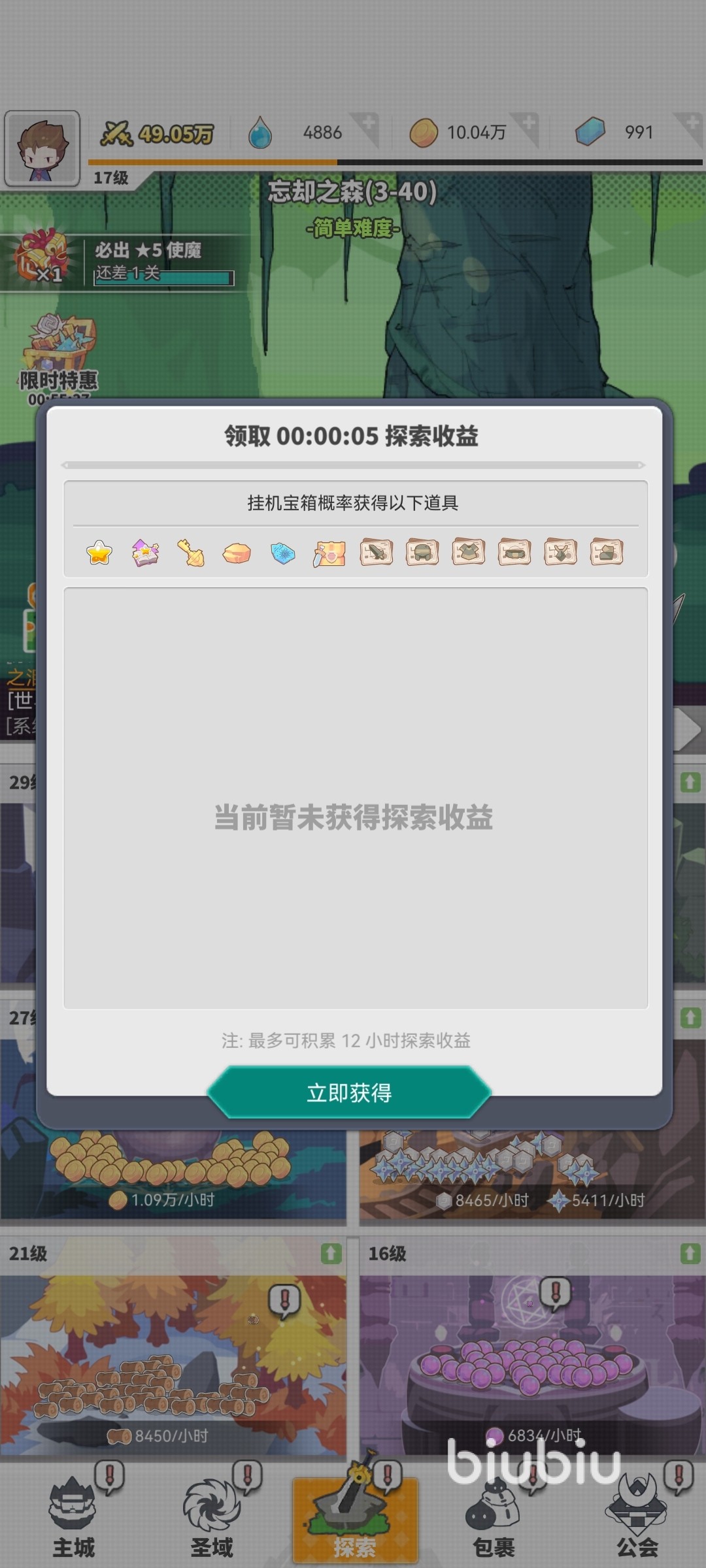 毕竟游戏是一款挂机向的游戏,等待足够多的时间在探索界面中间的宝箱当中也是能开出挂机奖励的,其中也有海量的经验能让玩家快速升级。