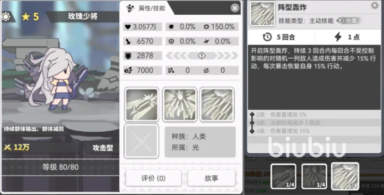 技能方面,破甲弹能够攻击两列敌人,两次有一定几率造成防化削弱状态,并且暴击回复自己行动,算是一个中规中矩的伤害以及削弱技能。不过主要玩法还是他那个轰炸,技能阵型轰炸可以持续,三回合内不受控制影响,对随机一类敌人造成伤害,同时并减少充能和恢复自身的行动充能。虽然是随机,基本上就那么几排伤害总归能打的到,且PVP模式下都可以凹,很强。